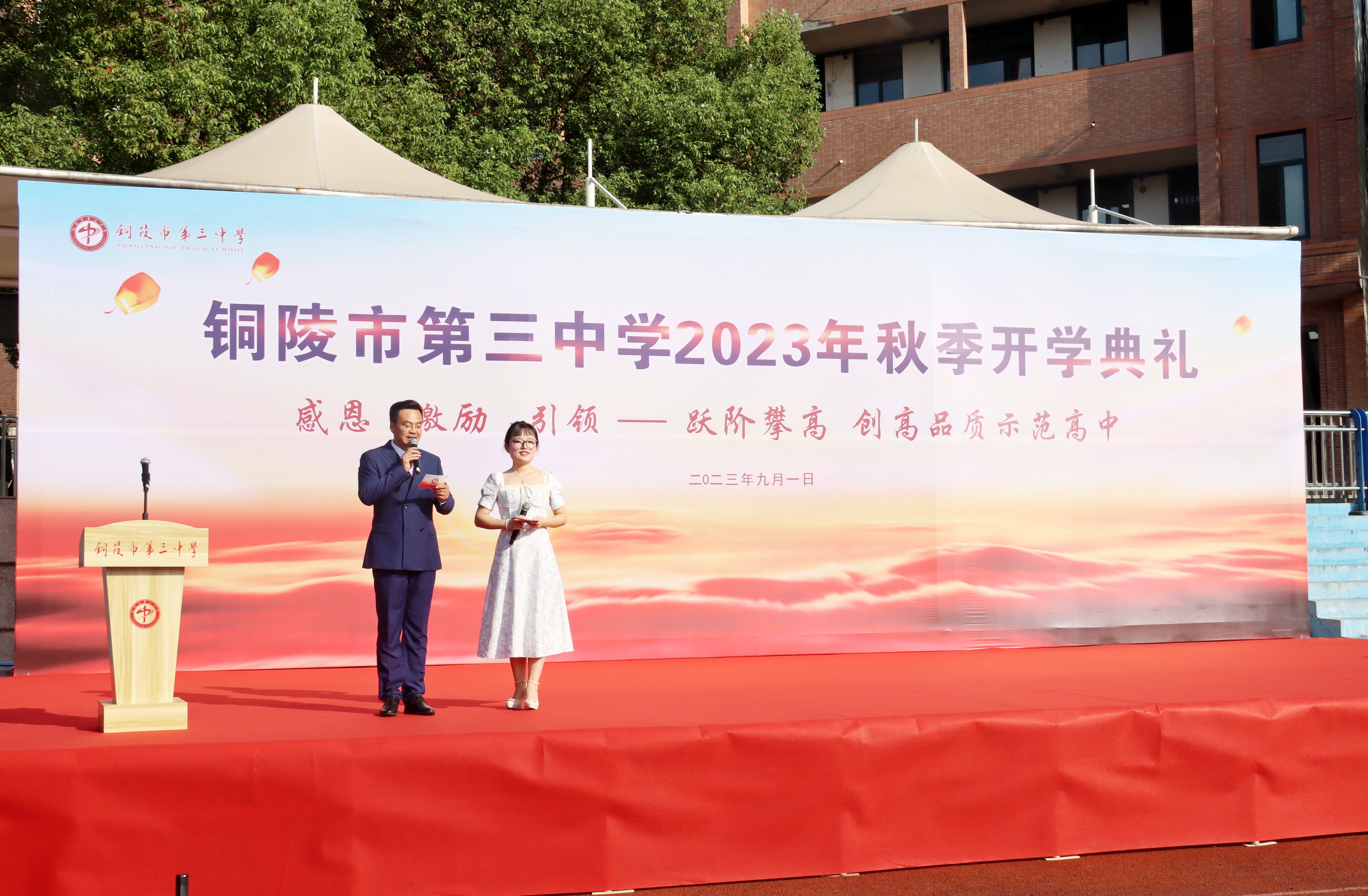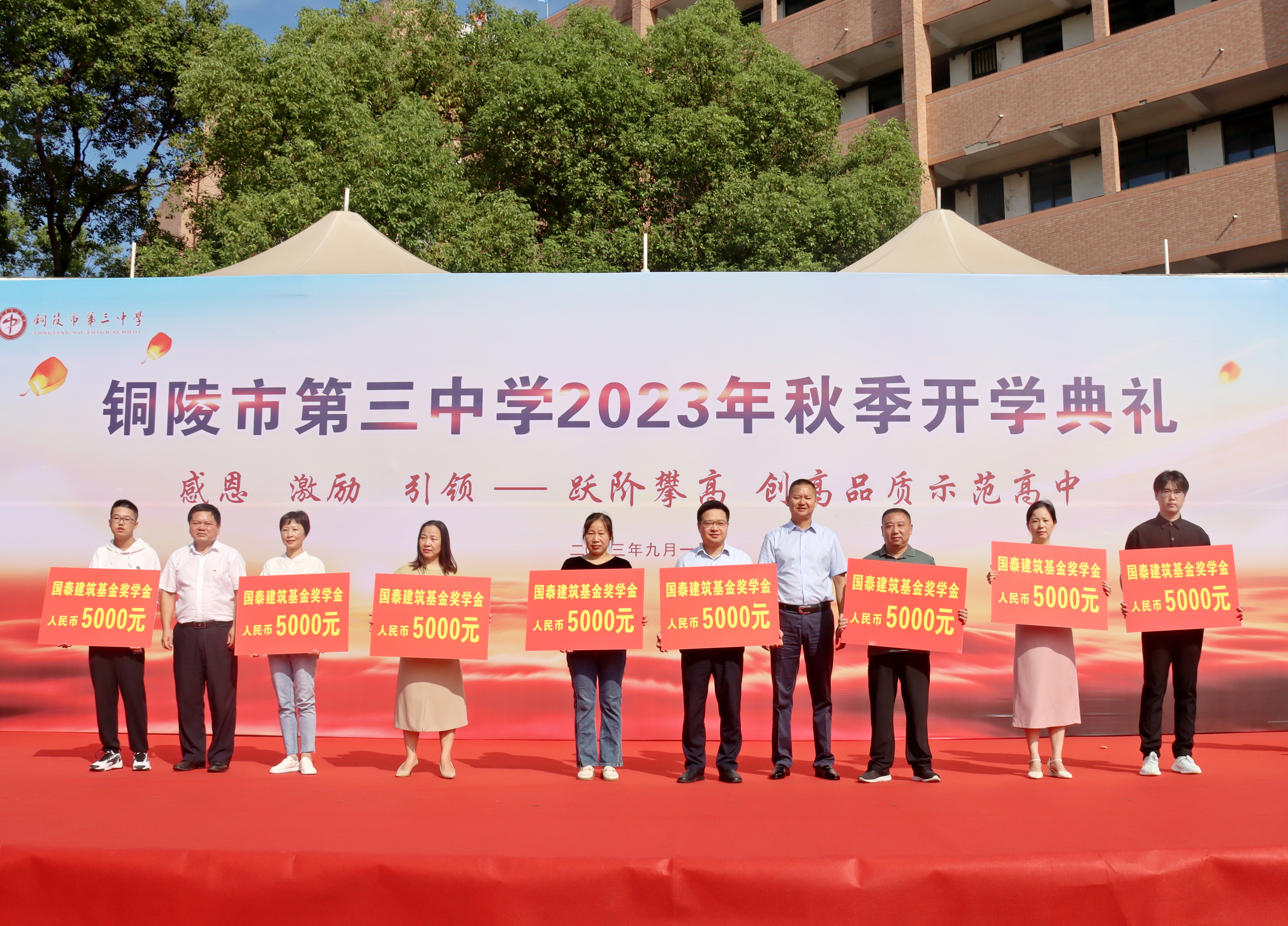 2023年9月1日上午,銅陵市第三中學 2023 年秋季開學典禮暨國泰建筑勵志獎學金頒獎儀式圓滿落幕。市三中校黨委副書記、副校長王合進,校黨委副書記張國榮,校黨委委員、副校長章學標,校黨委委員、副校長徐松成及全體三中師生參加活動。國泰建筑董事長張自州應邀出席。